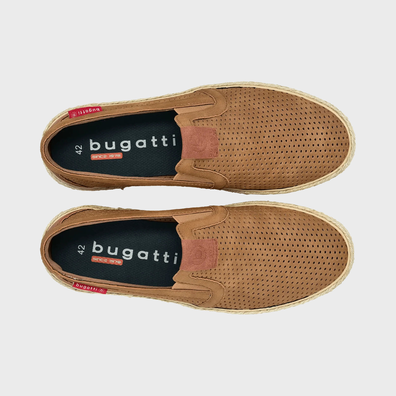 Tvrtka Bugatti osnovana je 1947. godine u Njemačkoj. Danas je sjedište tvrtke u Švicarskoj, a visokokvalitetni držači za cipele izrađuju se u Italiji, Bugattijevi dizajneri su kod kuće u Švicarskoj, Španjolskoj, Italiji i Njemačkoj. Trend skauti putuju u najveće svjetske metropole, a cipele se proizvode u Indiji i Kini, koža i potplati većinom se proizvode u Europi, a nekoliko posebnih komponenti, poput međupotplata i ljepila, nabavlja se iz Njemačke.